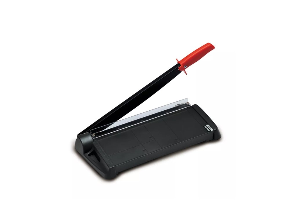 Páková řezačka na papír do formátu A4, která umožňuje aretaci nože ve spodní poloze. Pracovní deska obsahuje překreslené formáty papíru.