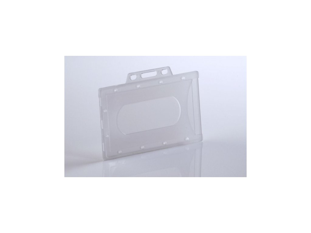 Tuhá plastová visačka pro kreditní karty - vodorovná, provedení z průhledného polomatného plastu. Jedna strana s oválným otvorem pro snadné vsunutí karty. Výhodou visačky je poměrně velký výsek 24x57 mm pro snadné čtení kódu, má zaoblené hrany. Možno zavěsit na klips se šlí (v našem sortimentu klips Americký, nebo klips Evropský), šňůrku nebo naviják. Úchyt s výsekem pro zavěšení 15x3 mm není součástí visačky, ale vystupuje. Vnější velikost: výška 60 mm x šířka 93 mm x hloubka 3 mm.
